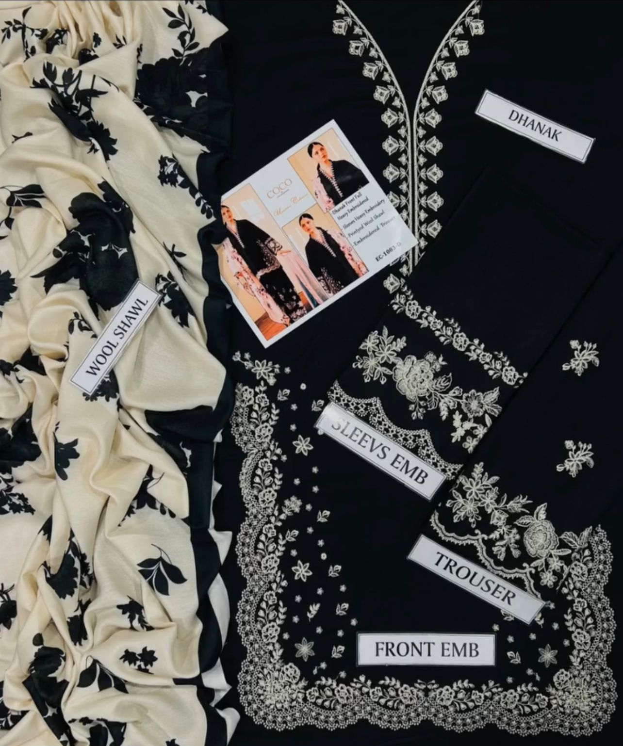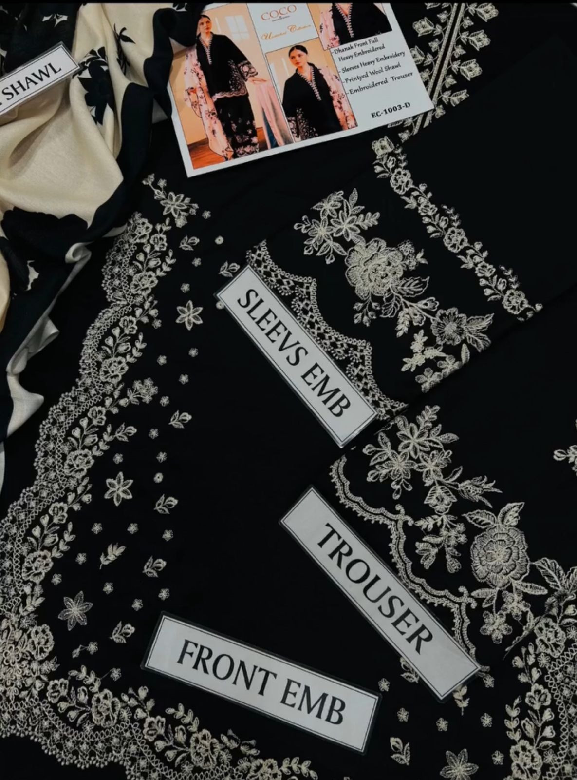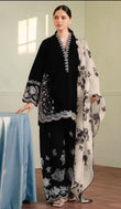 This elegant black and white embroidered suit is a perfect blend of traditional charm and contemporary style. The black kurta is adorned with intricate white floral embroidery, beautifully outlining the neckline, sleeves, and hem. The outfit is paired with a matching black pant, also featuring delicate white embroidery, adding depth and richness to the design. The look is completed with a contrast white dupatta, decorated with black floral patterns, offering a stunning visual balance. Ideal for formal occasions, this ensemble radiates sophistication and timeless beauty.